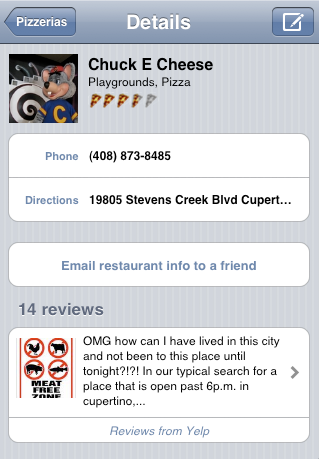 What: A prototype application for iPhone, Let's Pizza! uses Core Location to locate the user, then uses the Yelp.com API to find pizza places near the user. From within the application the user can call the pizza place for delivery, get directions from Google Maps and send information about the restaurant to a friend via email.