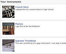 What: A simple Facebook application for listing which instruments one plays and seeing which instruments one's friends plays.