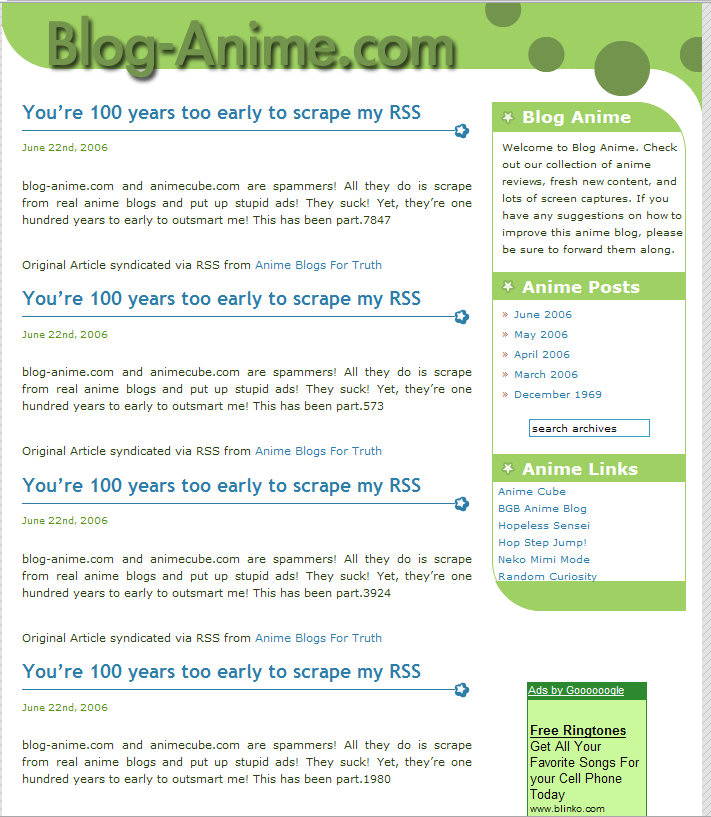 I noticed a while back in my Technorati blog backlinks thing that a certain blog was reposting all of the articles from my anime blog. It was an RSS Scraper that ran on some software called “Autoblogger Pro.” Basically, the site scraped posts from a number of anime blogs and reposted the content with adsense ads. While I didn’t mind the link back, it still bugged me that the person who set this up was simply profiting from other people’s work. I figured I’d do something about it.