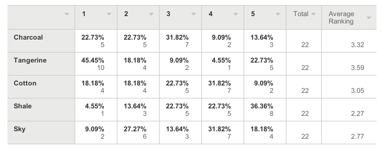 I got a Google Glass invite after signing up at Google’s official waitlist. After deciding I would go ahead and get one, I was paralyzed by the choice of which color to order. I made a survey that asked participants to rank the five colors in order of awesomeness. The results surprised me. I was leaning towards white (cotton) and sky blue, but everyone seemed to really like tangerine (orange).