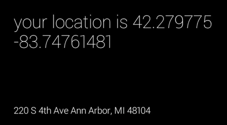 The app should now start getting location updates on the Glass (it can take a while to get a good fix) and update the Card once it finds you. The result should look something like this: