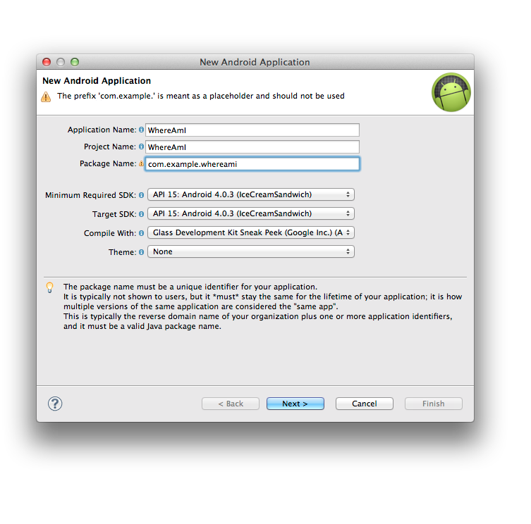 In this quick start guide, I’ll go through the steps of writing your first GDK app, “Where Am I?” This app will ensure you are never lost. By simply shouting “Okay Glass, where am I?” the app will find your latitude and longitude, and try to find the nearest street address.