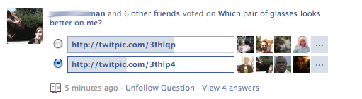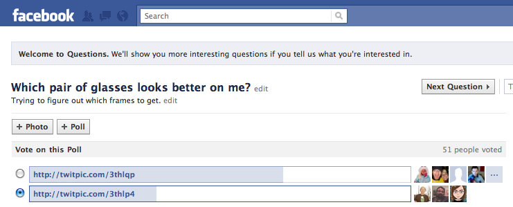 I figured I could do better with a more salient question, so I made one up myself. “Which pair of glasses look better on me?” I made the question have two twitpic links, which you can view here and here if you actually copy and paste them in. I figured people are naturally judgers, and something like helping someone choose glasses to wear is an easy task (plus you theoretically get to see pictures of faces, which people just love, consciously or subconsciously).