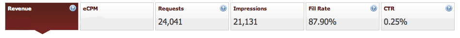 When iAd fails to deliver (85% of the time), I fall back to AdMob. The fill rate for AdMob is a high 88%, though the past few days it’s been closer to 99%. The CTR, however, is a fairly low 0.25%, which is less than half of iAd. This is partly due to the fact that AdMob ads refresh more often, so the number of impressions is higher.