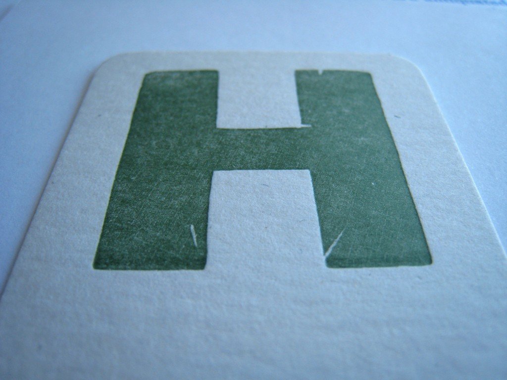 I like the grainy look of the block ‘H’. Each one looks a little different, and at one point I mixed in some more blue to make it a darker green. It’s nice that the card itself is a slightly unique print.