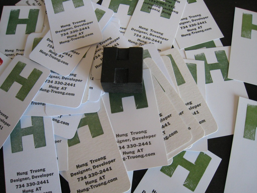 I’ve been busy printing random stuff on my letterpress. I got some color ink and an old wood ‘H’ block. Oh, and I also ordered some blank business cards, so I decided to print myself a few.