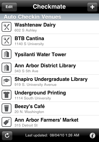 My second iPhone app, Checkmate, just got approved in the Apple App Store last night. It’s an auto-check-in app that runs in the background. You select your favorite venues, and Checkmate will check you into them when you get close enough, even when the phone is still in your pocket! I wrote this app because I got annoyed at forgetting to check into places on foursquare while there.