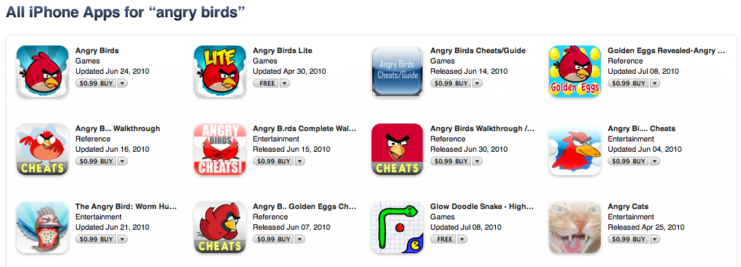 I noticed that there are a number of “Angry Bird” apps, but only two of them are the original. Angry Birds and the lite demo version. The others are all either cheat/walkthrough guides, or random knockoffs. The insane thing is that the price of the actual game is $1, and so are the knockoffs! You can buy the game for the same amount as an unauthorized guide, which has information freely that’s available online! The craziest one is the app called “The Angry Bird,” which has an angry looking bird trying to kill worms or something. I am assuming all of these apps are legal under fair use and whatnot (if they’re only stating facts), yet something tells me they could be violating trademark rules…
