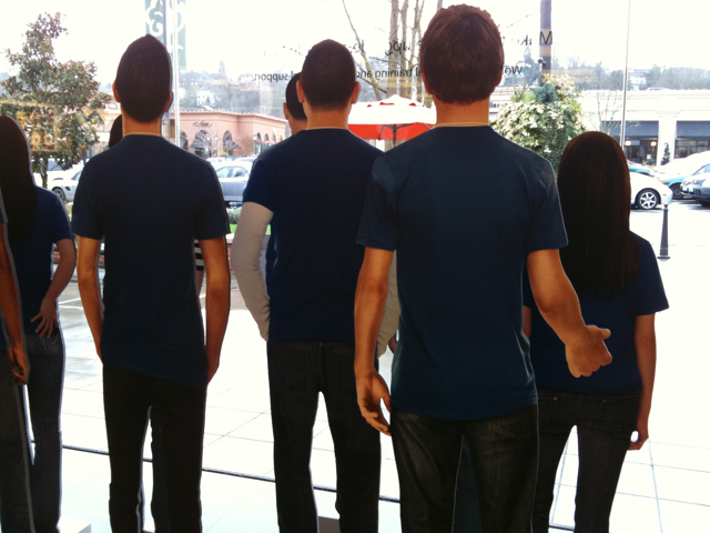 I was at the mall today just wasting my time (and looking at options for getting my eye prescription checked), and I stopped by the Apple Store. As I approached, I noticed an army of people in blue shirts, just waiting to help anyone who walked in. I soon realized that they were just cardboard cutouts.