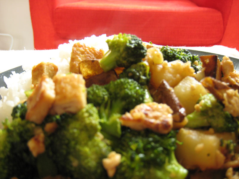 I cook sometimes. It’s pretty fun and my food actually turns out pretty delicious sometimes. Today I made a new dish which I will call “PoBroccoFu Delight.” It’s the second time I used potatoes in a stir fry environment and the first time I successfully did so.